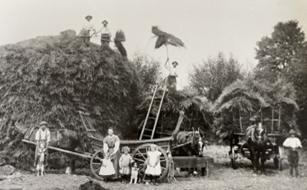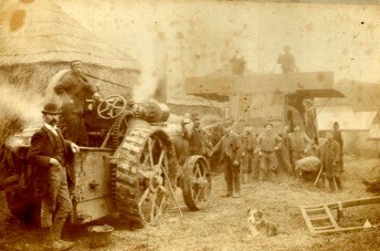 Gang of men working a steam powered threshing machine in Dundon 1896