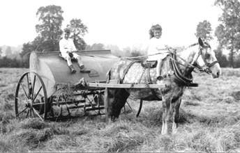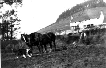 Farm worker and his dog ploughing a field with two horses. The field is below Beacon House, Dundon